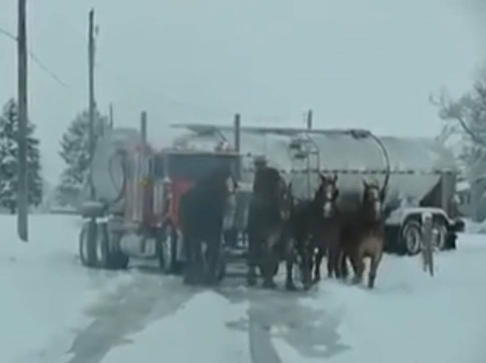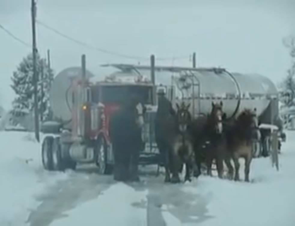 It would take an eventual snowplow with road salt and a tow truck to get this behemoth unstuck. But luckily, there were some horses nearby. And when the man behind the reins told his four most powerful horses to pull, they managed to rip that huge tanker out of the ice with no real trouble.