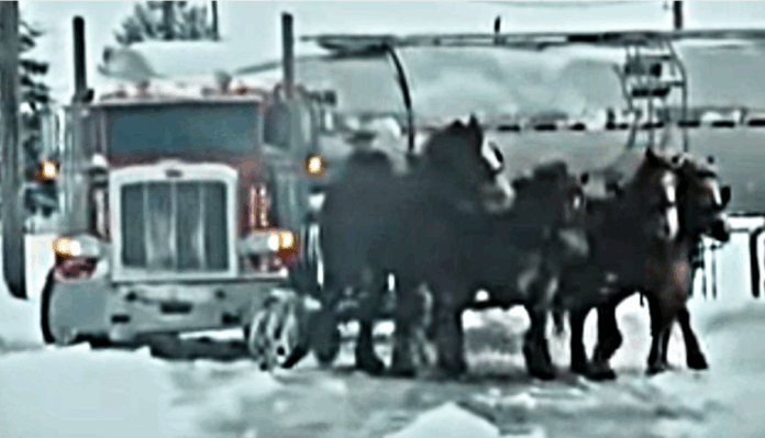 It would take an eventual snowplow with road salt and a tow truck to get this behemoth unstuck. But luckily, there were some horses nearby. And when the man behind the reins told his four most powerful horses to pull, they managed to rip that huge tanker out of the ice with no real trouble.
