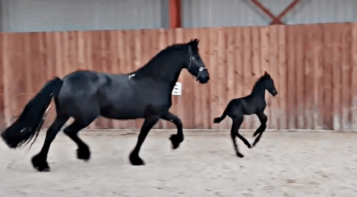 Friesian horse filly Mathilde’s first steps into the indoor arena marked the beginning of her promising journey in the world of equine sports. As she continues to grow and develop under the guidance of her handlers, trainers, and her dam, she is poised to follow in the footsteps of her illustrious parents. As we follow Mathilde’s progress, we can look forward to witnessing the blossoming of a new equine star. Please have a look at the video below for more, let us know your thoughts on the video, and do not forget to spread out the video on social media with your friends and family in order to make their day beautiful as well.