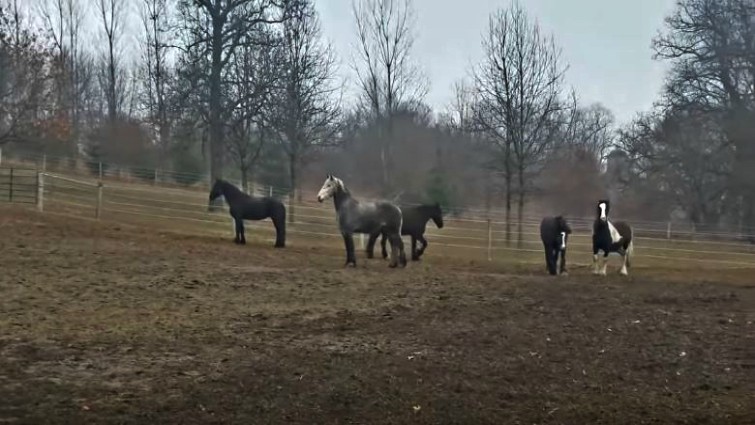 This group of five firm horses surely knows how to wake up to the morning in style. As you can see they can’t hold back the excitement and are moving all around as they are waiting to get breakfast. It is the most important meal, indeed! They respond nearly as one, firstly trotting, and then jumping. As soon as the first one jumps, then the others follow the lead and weave back and forth.