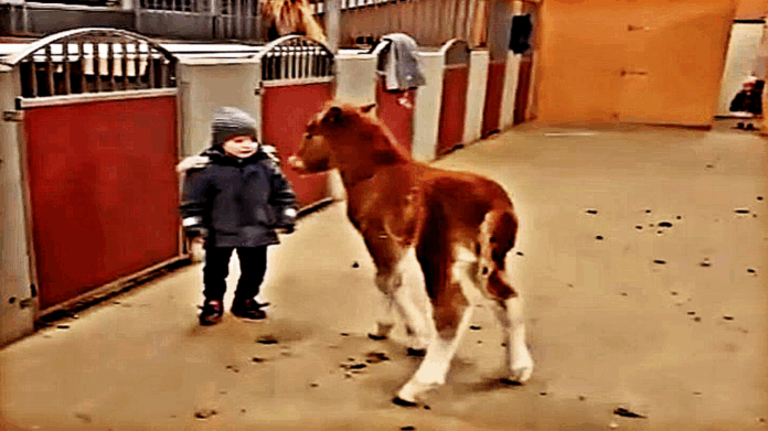 A bond like this one is special and rare. There’s truly nothing like a little boy and his foal. In the video below, posted on December 16, 2016, a 5-year-old boy walks up to the red wooden door of a horse stable. There is a small foal standing by the entrance, and the boy grabs his face firmly to say hello.