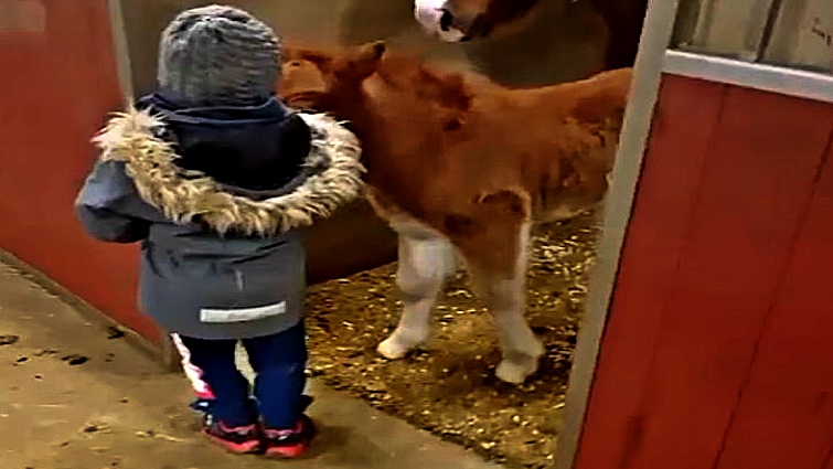 As the horses emerge, the toddler yells, “Whoa!” Then, it’s time for the boy to show off his friendship with the chestnut-colored foal. He kisses the baby horse on the head and soon, they start running around the stable together, side by side.
