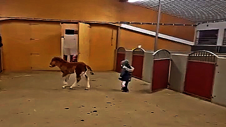 Suddenly, the young child takes a step back to open the door all the way. That’s when the baby horse gallops out of his quarters and out into the open. A larger horse follows, and the 5-year-old seems like he is in shock.