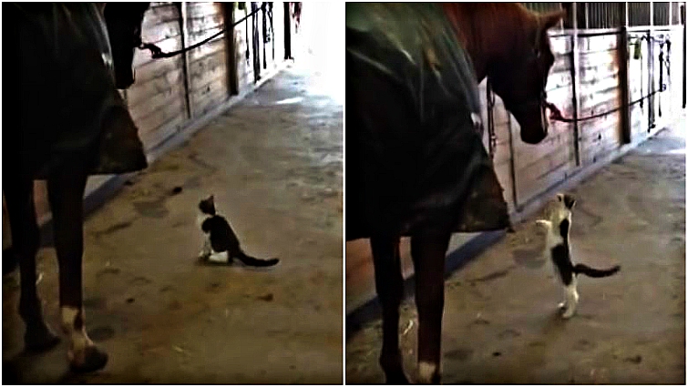 The cat even stands on his hind legs and reached his paws up to get a little hug. Aww! He’s so sweet. Looks like this kitty is always up to something at the barn and has a whole lot of love to give. Will he get the horse’s attention at the end? I guess you have to watch the video to figure it out.