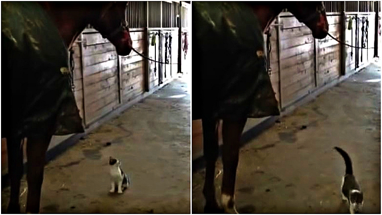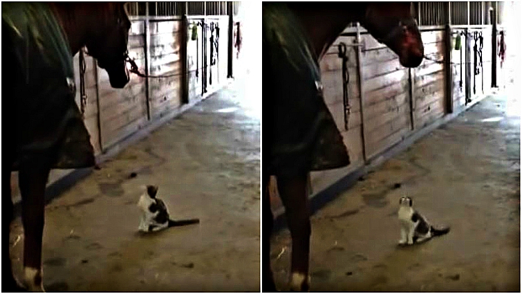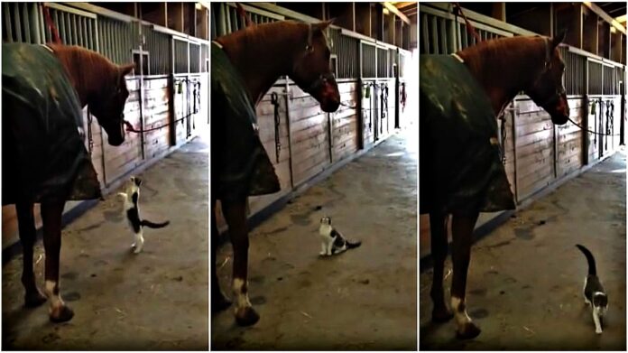 Hoping to cuddle up with one of the horses, this adorable feline was caught doing the funniest thing to get the horse’s attention. This adorable cat obviously loves the horses — but in the clip, he can’t understand why the horse won’t lower her head to nuzzle him.