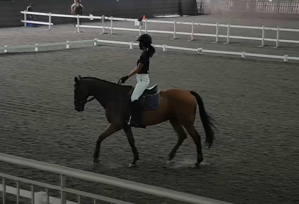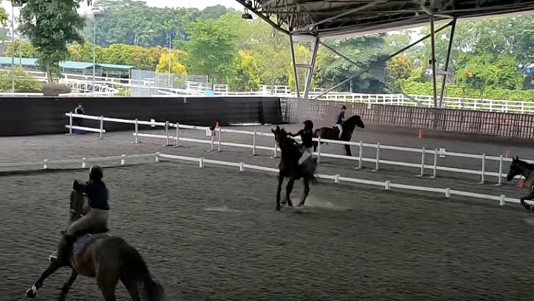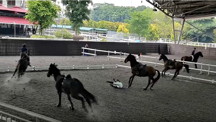 There are four horses in this lesson and one in particular is very sensitive to all rain elements. As there was a training and horses were calmly cantering one of them spooked and bucked his rider off upon thunder in a distance. Then what follows is the domino effect, the second horse also spooked and threw the rider off, followed by the third horse and the fourth.
