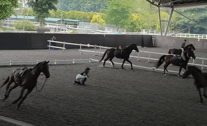 There are four horses in this lesson and one in particular is very sensitive to all rain elements. As there was a training and horses were calmly cantering one of them spooked and bucked his rider off upon thunder in a distance. Then what follows is the domino effect, the second horse also spooked and threw the rider off, followed by the third horse and the fourth.