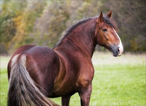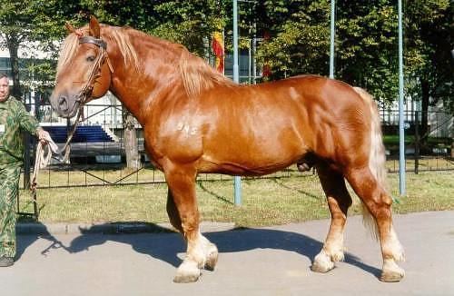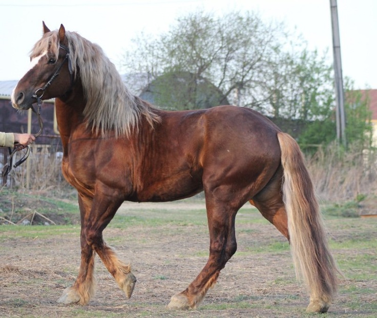 This small draft horse that was powerful, adequately fast, easy to keep and economical as regards supervision and feeding, went on in Russia was purposely developed in order to compete with the breeding of a large heavy draft breed. The hereditary element for the breed came from native Ukrainian breeds, the mountain Ardennes and, in part, from the Brabancon and the Orlov Trotter. Due to its high-profit feeding and high versatility, the Russian Heavy Draught became quite popular. It is now bred in different countries Ukraine and North Caucasus, in Udmurtia and Byelorussia, in Kirov, Sverdlovsk, Perm, Vologda and Archangel regions and in western Siberia.
