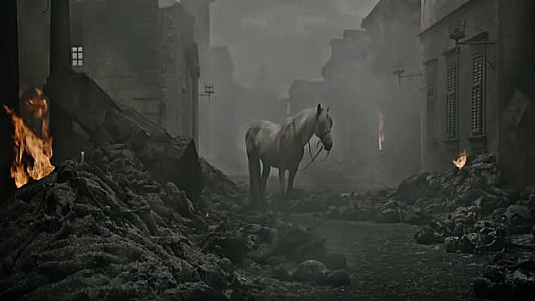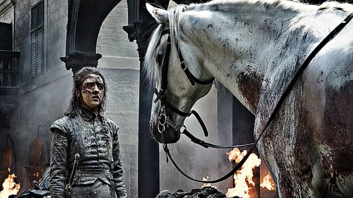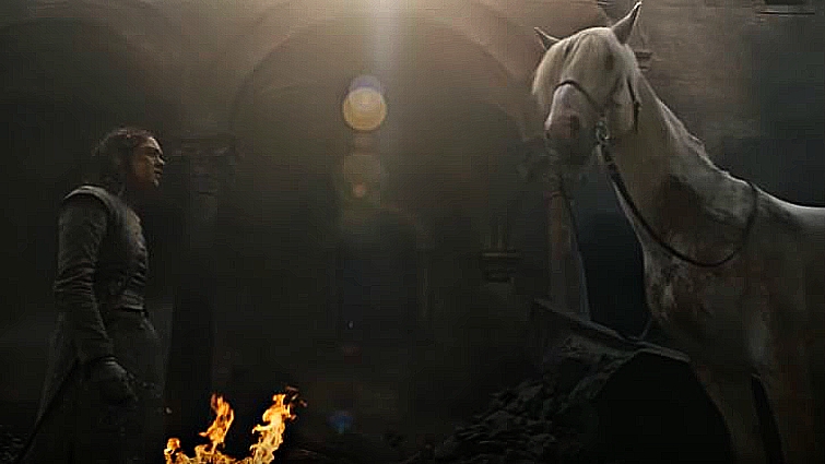 One of the protagonists, Maisie Williams (playing Arya Stark) survived a massacre cause by Emilia Clarke (playing Daenarys Targaryen). In a place where everyone was dead except Arya, a gorgeous white horse appears at the end of this episode.