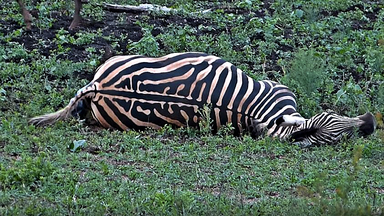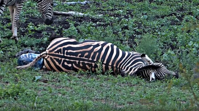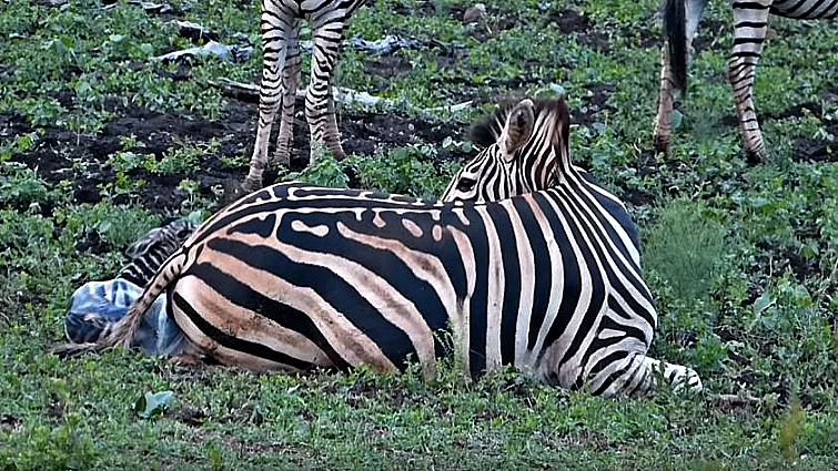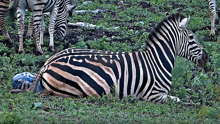 In the clip, the mother zebra is on the ground, she back turned toward us. You can see she’s breathing heavily and pushing hard: she lifts up her legs as if to help guide the little one out. Before you know it, you can clearly see the baby’s head! When he’s about halfway out of Mom, he starts moving on his own.