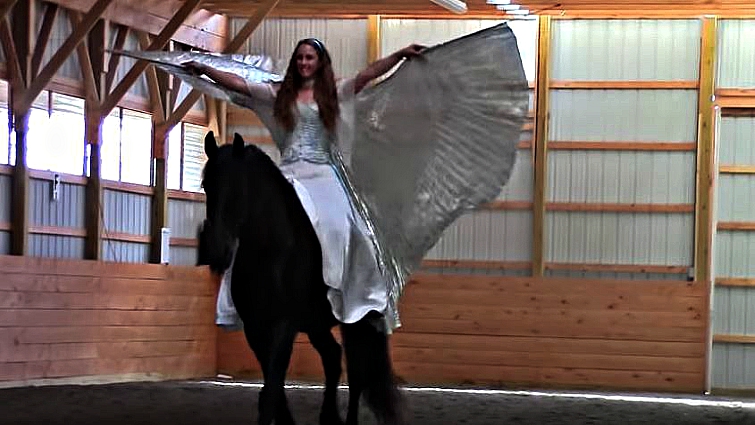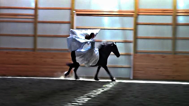 Ensuring that the horse’s experience is as positive as the rider’s, she often rides with a bitless bridle, on a bareback pad, and sometimes even completely bridle-less; these horses are all treated with the love and respect that they deserve to be given. Mounted on her 13-year-old horse Douwe, this is the first time the pair have performed their “Wings of Isis” dance routine without a bridle, and it’s quite obvious that these horses are incredibly well-trained.