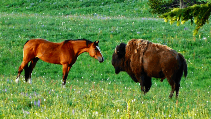 The friendship that we are going to talk about is not quite a friendship but it potentially might be in the future. In the video footage beneath this text, you’ll see a scene that was recorded recently on a 6-day horse pack trip through Yellowstone. Clearly, both the horse and bull were in a good mood because as you can see neither of them seemed to show aggressive behavior.