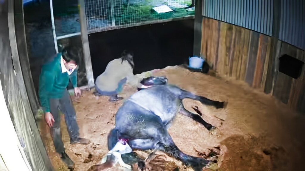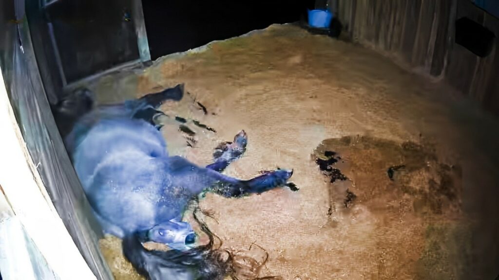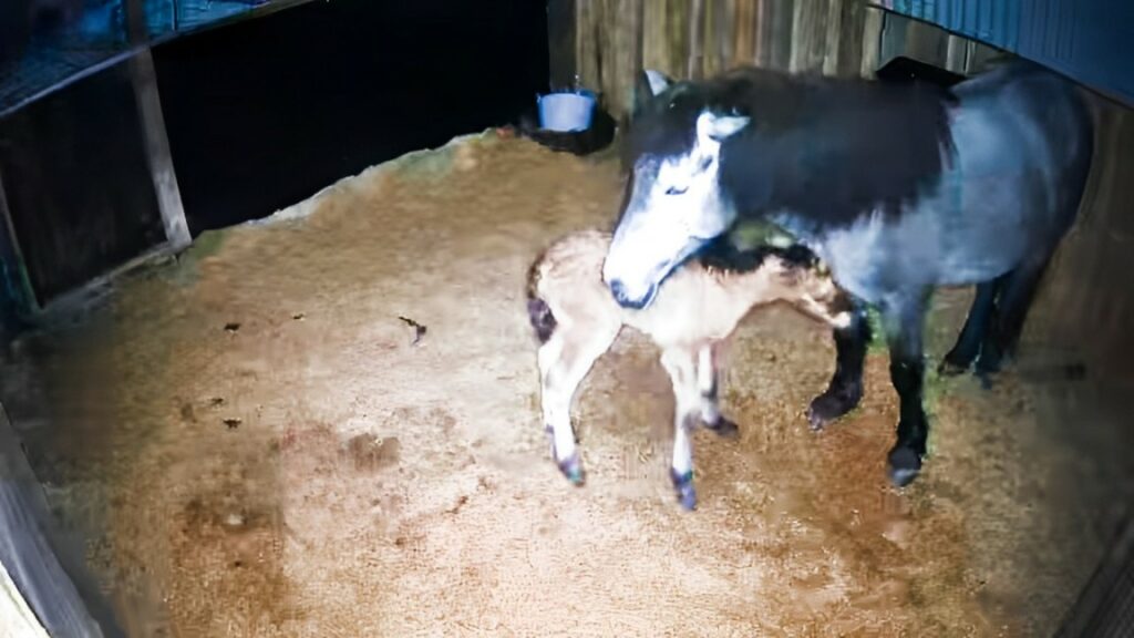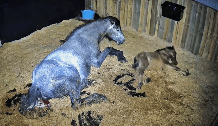 In a touching display of nature’s wonders, Harkaway Lodge Stellar, a brave grey mare, recently experienced the miracle of birth, bringing into the world a beautiful filly named Beinn Kaldy Sionnach. However, Sionnach’s debut was not without its hurdles. During the birthing process, one of her front legs was awkwardly positioned along her neck, presenting an immediate challenge that required human intervention. Unfortunately, this critical moment of assistance went undocumented as the recording device timed out. Thankfully, with the owner’s timely intervention, the situation was swiftly managed, ensuring a safe continuation of the birth.