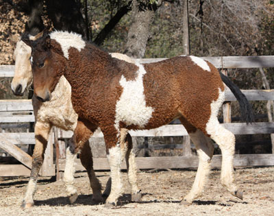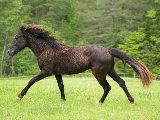 The sleepy look is actually very favorable, as they have a sharp look, are very quick and not slow. Their oddly tough black hoofs are almost flawlessly round in shape. The foals have thick, curly coats almost matching Astrakhan (‘as-tra-kan) wool, even inside their little thick ears. They have excellent curly eyelashes that would make any human jealous. Curlies are born with an extraordinarily loving nature and are very friendly. They have a double mane which cuts down the middle leaving curly locks swinging on both sides of the neck.