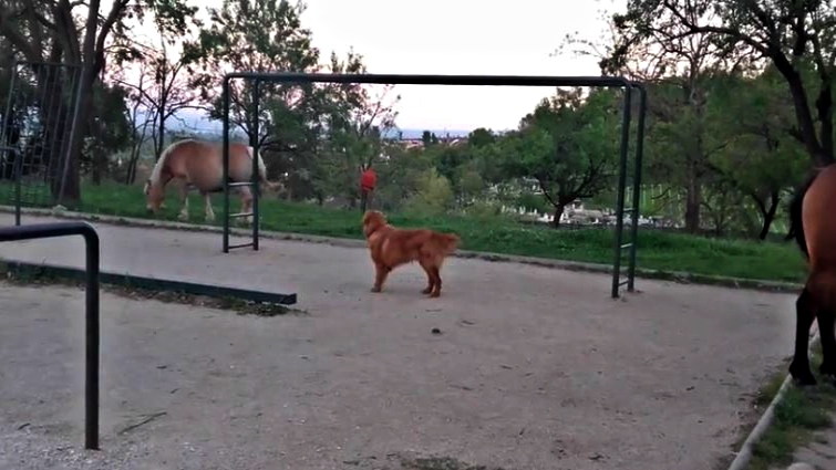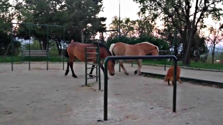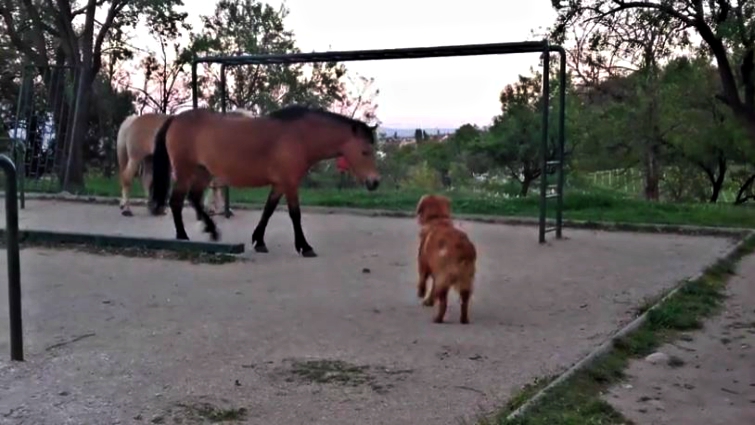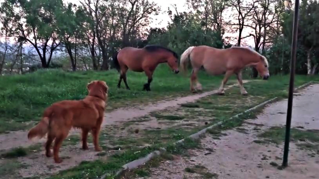 When he gets too close, though, he actually looks a bit frightened of his would-be playmates. These horses keep ignoring him but he does not give up until they befriend him. No matter how much this dog tries, the horses do not want to play with him.