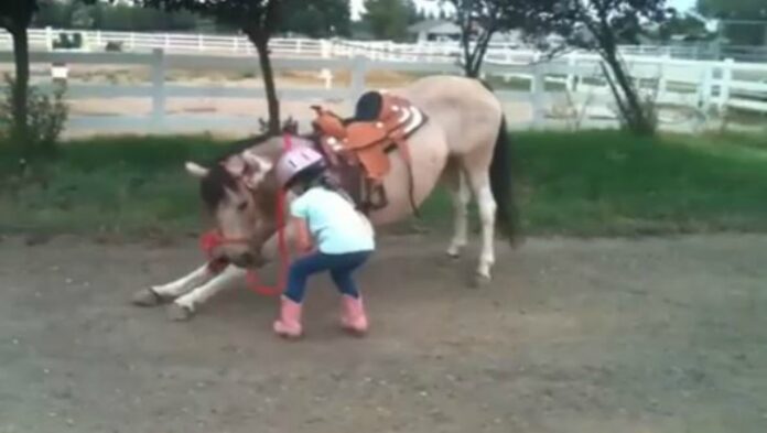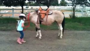 What you are going to watch in this video is a little girl who has developed her own technique of getting on her horse. It’s not easy to teach a horse to do something but this cute little rider set a goal for herself and reached it. She has practiced this new way of mounting a horse and now that she wants to share it with other and show us that you definitely can reach what you want if you work really hard towards it. Her mother caught her on video and helped her demonstrate the new trick.