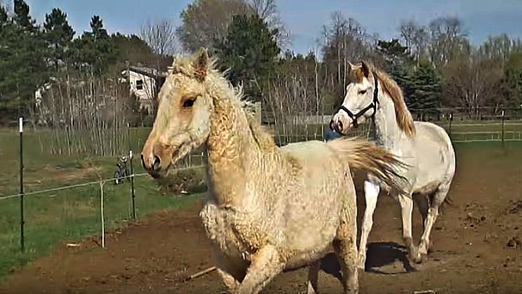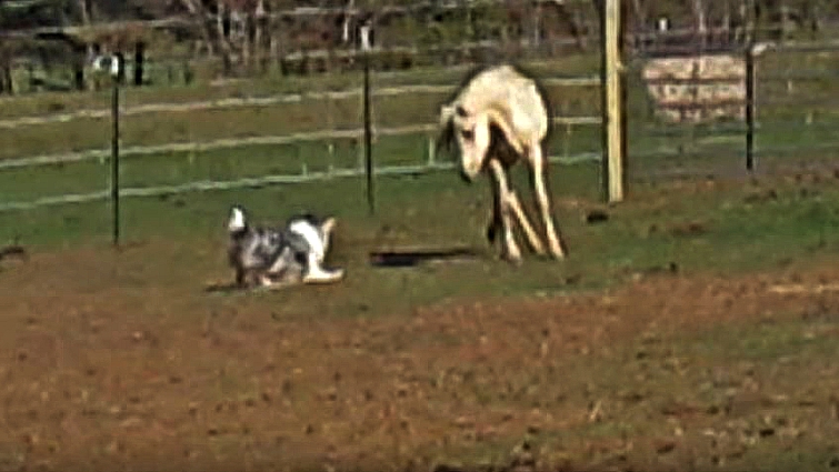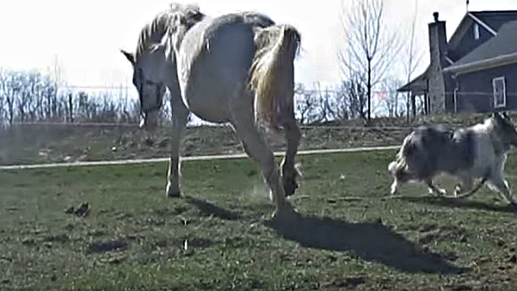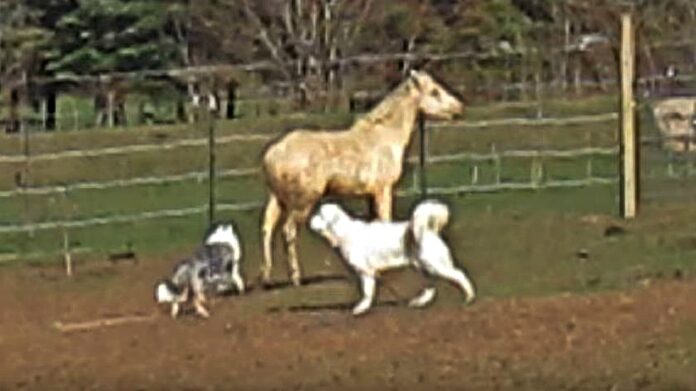 “Here is my pregnant mare Velvet and 2-year-old April playing with my collie, Angel, and Great Pyrenees, Lady, out in the pasture just having fun,” their owner wrote on YouTube. In the video, the two horses and two pups waste no time playing together and really seem to be enjoying the beautiful weather.