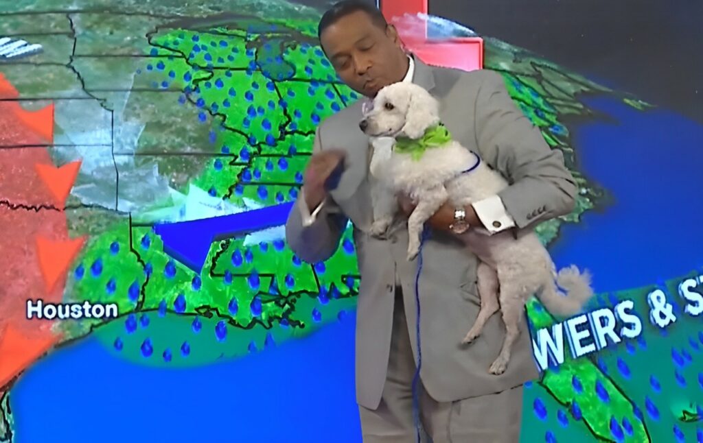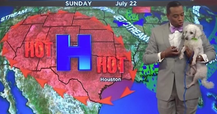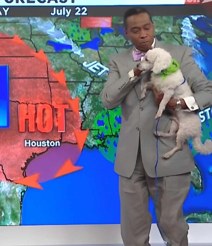 During the weather forecast, Weatherman Khambrel Marshall was surprised by Angel’s impromptu appearance on set. Without missing a beat, Marshall embraced the moment, lifting Angel into his arms and inviting the pup to join him in presenting the weather. The duo quickly became a hit, with Marshall using the opportunity not only to discuss the day’s record highs but also to remind viewers of the importance of pet safety during hot weather. Marshall’s natural rapport with Angel and his improvised advice resonated with viewers, showcasing a heartwarming blend of professionalism and compassion.