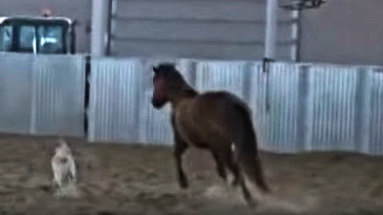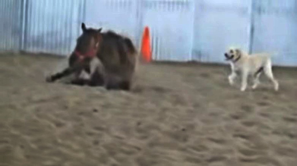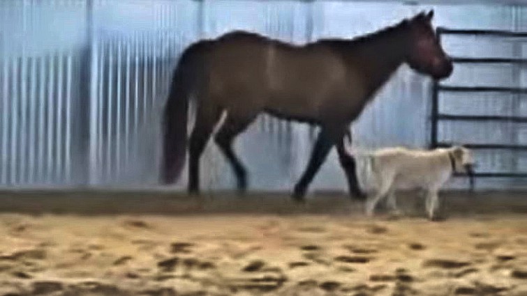 In the trainer’s absence, Cookie took it upon herself to step in and entertain Annie, while making sure her horse pal got enough exercise that day. Judging from the video below, she did a fabulous job! It’s no wonder the mare was raised among dogs and the dog among horses. Notice the communication in their respective languages. These two animals are both playful, curious, and kind, as one takes cues from the other.