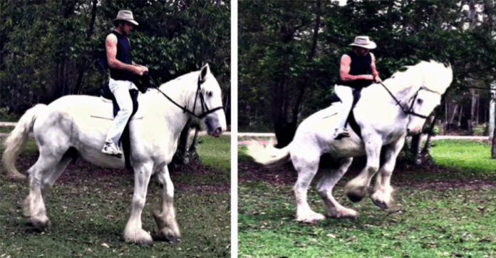 Draft horses are known for being some of the most gentle and calming horses in the world, that’s why we were surprised when we watched this unusual video of a draft horse who was bucked off and thrown his rider from the saddle. Mark, the rider starring in this video, is a great equestrian and during the time the video was shoot, he had just gotten a new gorgeous draft horse.