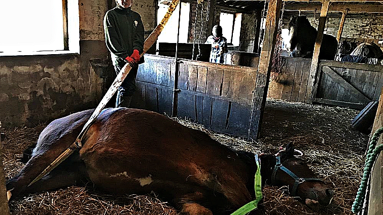 One of which is a 16-year-old mare called Beatrice. Beatrice had been stablemates with an 11-year-old stallion, named Beau, for years. From the sounds of this story, they had developed quite the friendship in their years sleeping alongside one another. Beatrice fell dangerously ill recently,  falling to the ground with severe abdominal pain. The longer that she remained on the ground, the greater her risk of dying became. If she stayed grounded for too long, she would go into organ failure. Donald, Jane, and four farmworkers worked tirelessly to lift her up onto her feet but to no avail.