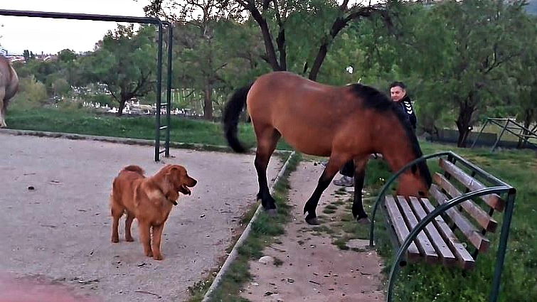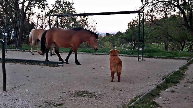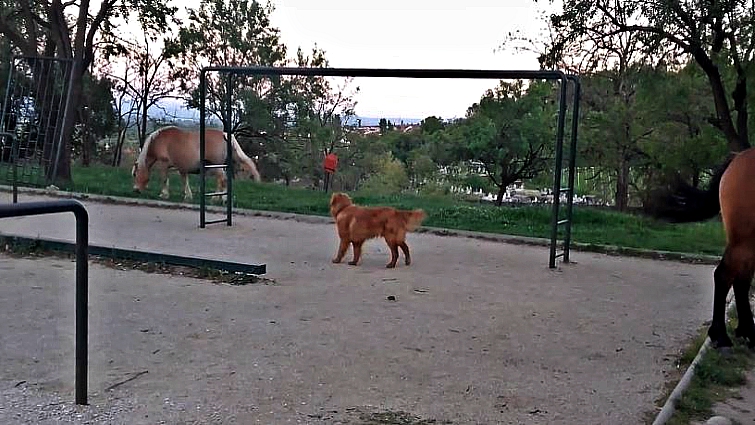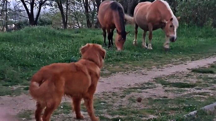 You can tell the dog was very interested in meeting the horse for the first time as you will see in the video that you are about to watch real soon. Although horses were not interested in spending time with him, the dog is insisting as much as he can to be accepted in their “squad”.
