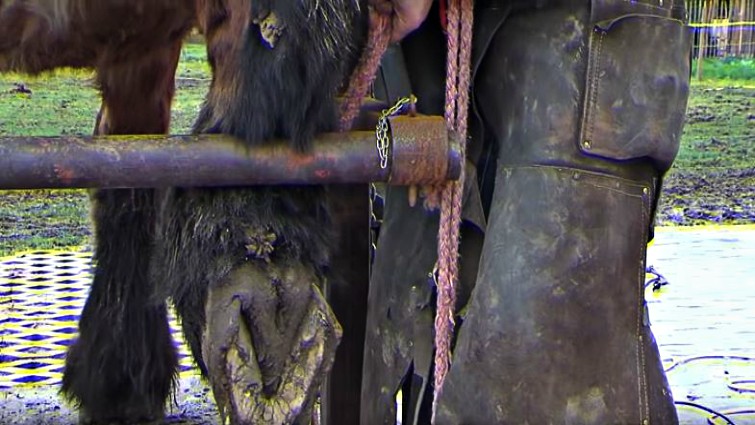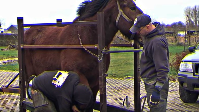Mud fever is a disease that causes irritation in the lower limbs of horses, and very often it is caused by a mixture of bacteria. This draft horse is probably not feeling comfortable and he is repeatedly kicking with his hind legs. Luckily, he is in good hands and that farrier knows how to handle the situation. In such situations, we really get to understand the importance of farriers in the horse world.