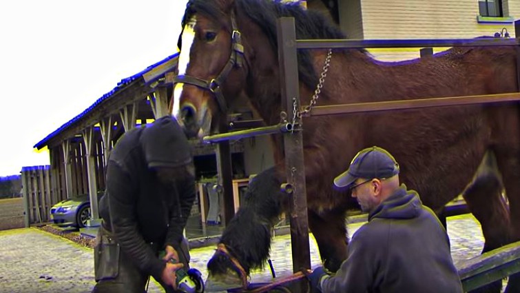 We should just hope not to get into such situations. Now let’s get back to our story. The horse from this video is suffering from “mud fever” and that’s why he has it difficult to give its hind legs. This experienced farrier wanted to demonstrate the process of trimming the hooves of two Belgian Draft in Flanders, Belgium.