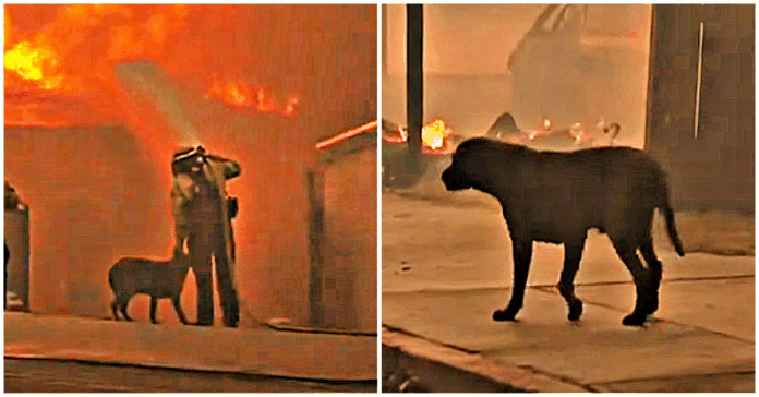 Amid the intense efforts to control the fire, one firefighter’s act of kindness stood out. In the footage, the firefighter can be seen using one hand to hose down a burning house while gently petting a frightened dog with the other. The dog, disoriented and clearly terrified, found solace in the firefighter’s reassuring presence. The video has since gone viral, with countless viewers praising the firefighter as a hero not just for their work battling the flames, but also for their compassion toward the helpless animal.