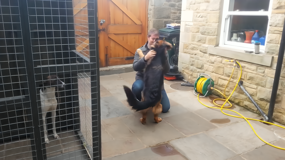 As Freya’s owner opens the door to let her outside, the unsuspecting pup is greeted by her mom. Little does she know, her dad is waiting just around the corner, ready to surprise her. When she hears her dad’s voice calling her name, Freya’s excitement knows no bounds. The German Shepherd spins in circles, whines with happiness, and wags her tail furiously as she greets her dad. The months of separation have only intensified her love and longing for him. Her sheer joy is palpable as she revels in the moment of reunion.
