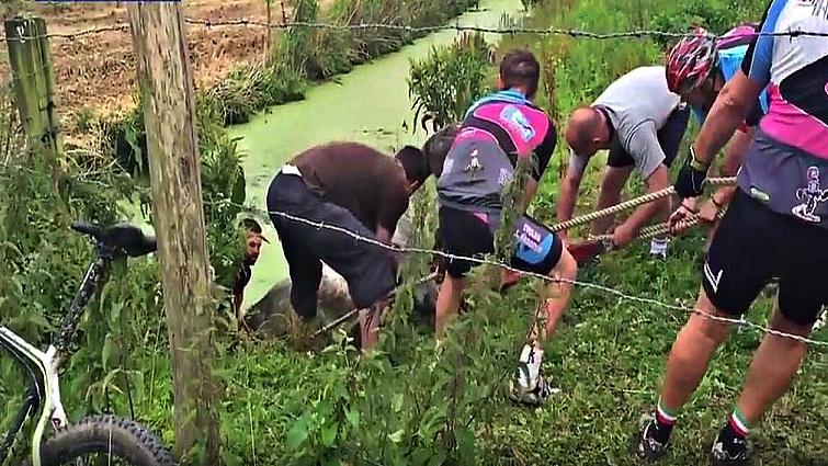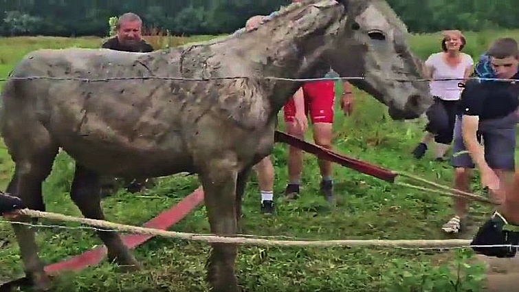 It was a very difficult rescue, but the amazing group of cyclists finally managed to save the poor horse. They were really smart to create a rope as fast and as huge as they could find and only by using their power they were able to pull the horse.