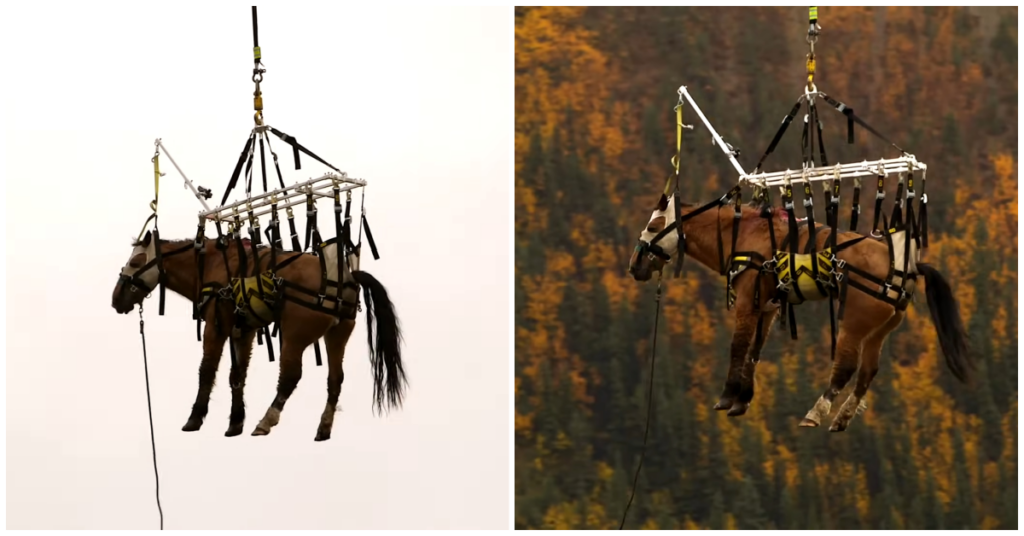 The image of Lucky, suspended in the air and transported across the sky, was both surreal and awe-inspiring. Despite the precariousness of his situation, Lucky appeared calm, perhaps even curious, as he gazed out at the horizon. This extraordinary scene was a poignant reminder of his bravery and the unusual yet profound connection that had formed between him and his rescuers. It’s rare to see a horse flying through the sky, and yet there was Lucky, embodying the spirit of survival and the trust he placed in the humans fighting to save him.