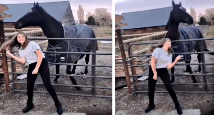 A heartwarming video has recently taken the internet by storm as it showcases the extraordinary bond between a girl and her horse. As they dance together in perfect harmony, it’s evident that the love they share is not just about riding, but also enjoying each other’s company in a unique and creative way. This delightful video has captured the hearts of millions, and it’s easy to see why. In the video, the girl starts dancing to an upbeat tune. With grace and enthusiasm, she moves with the rhythm, and to the viewers’ surprise, her horse immediately follows her lead.