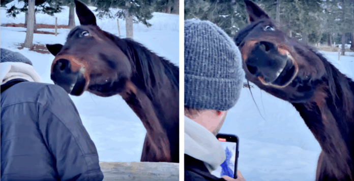 Everyone loves a good laugh, and in the world of animals, sometimes our furry and feathered friends bring us the most joy with their antics. While it’s common for people to find humor in the quirky behavior of their pets, horses are often overlooked as potential comedians. However, one particular horse named Freedom, at a ranch in Thompson Falls, Montana, is proving that horses can be just as funny and entertaining as any other animal. At the picturesque ranch in Thompson Falls, the owners were spending some quality time with their equine friends. Among the herd was Freedom, a friendly and curious horse who seemed to have a keen interest in everything his human companions were doing. As they interacted with him, they couldn’t help but notice his unusual behavior.