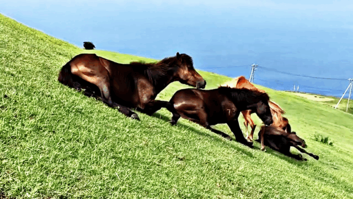 The video was caught on Cape Toi, Japan as four major ponies move on their backs and begin sliding while excited foal watches from the side. As we watch the video we observe that ponies enjoy extraordinary doing what they are doing as they hang out together and absorb the mid-year sun. Possibly, they are additionally attempting to take care of them, have a sliding race down the slope, or maybe released themselves of bothering flies.