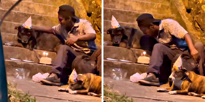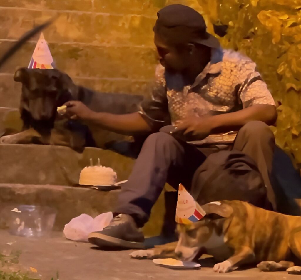 In the heart of Bucaramanga, Colombia, a simple yet profound act of love and kindness unfolded, reminding us of the deep bonds that can form between humans and their animal companions, and the powerful ripple effects of a single act of generosity. Choco, a homeless man with nothing but love for his two dogs, Shaggy and Nena, decided to celebrate Shaggy’s birthday in the modest surroundings of a public park. With party hats perched on his furry friends’ heads and a small cake at the ready, Choco created a moment of pure joy amidst the hardships of life on the streets. The scene was heartwarming: a humble birthday party, complete with a rendition of ‘Happy Birthday,’ cake, and affectionate cuddles, all captured on camera by a passerby.