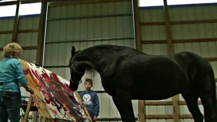 Justin is a beautiful 1,500-pound horse that loves to paint more than anything in the entire world! It all started when his owner noticed him trying to draw outlines in the sand with an old riding-whip. After discovering his talent, Justin’s owner decided to invest more money and time on his horse’s talent.