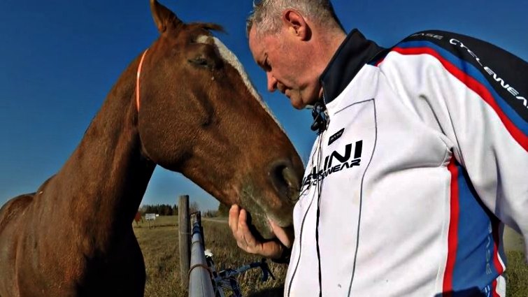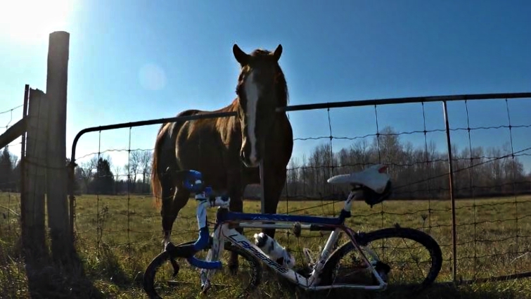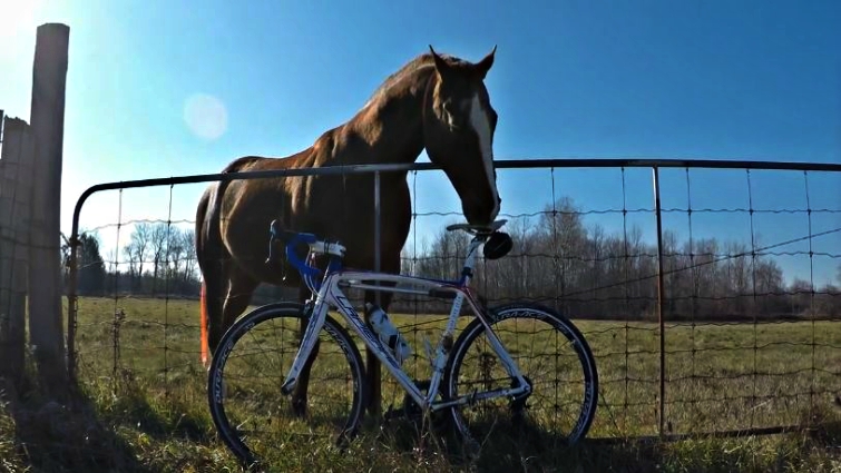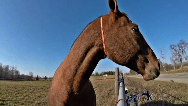 But there’s one problem with feeding a horse: if you run out of apples and granola bars, they tend to start acting a bit strange! That’s what happens with the biker, he runs out of apples and Reddy is really angry about it because he was expecting to eat more apples. The man was getting ready to leave to continue his bike ride, but not before this grumpy horse knocks the bike over.
