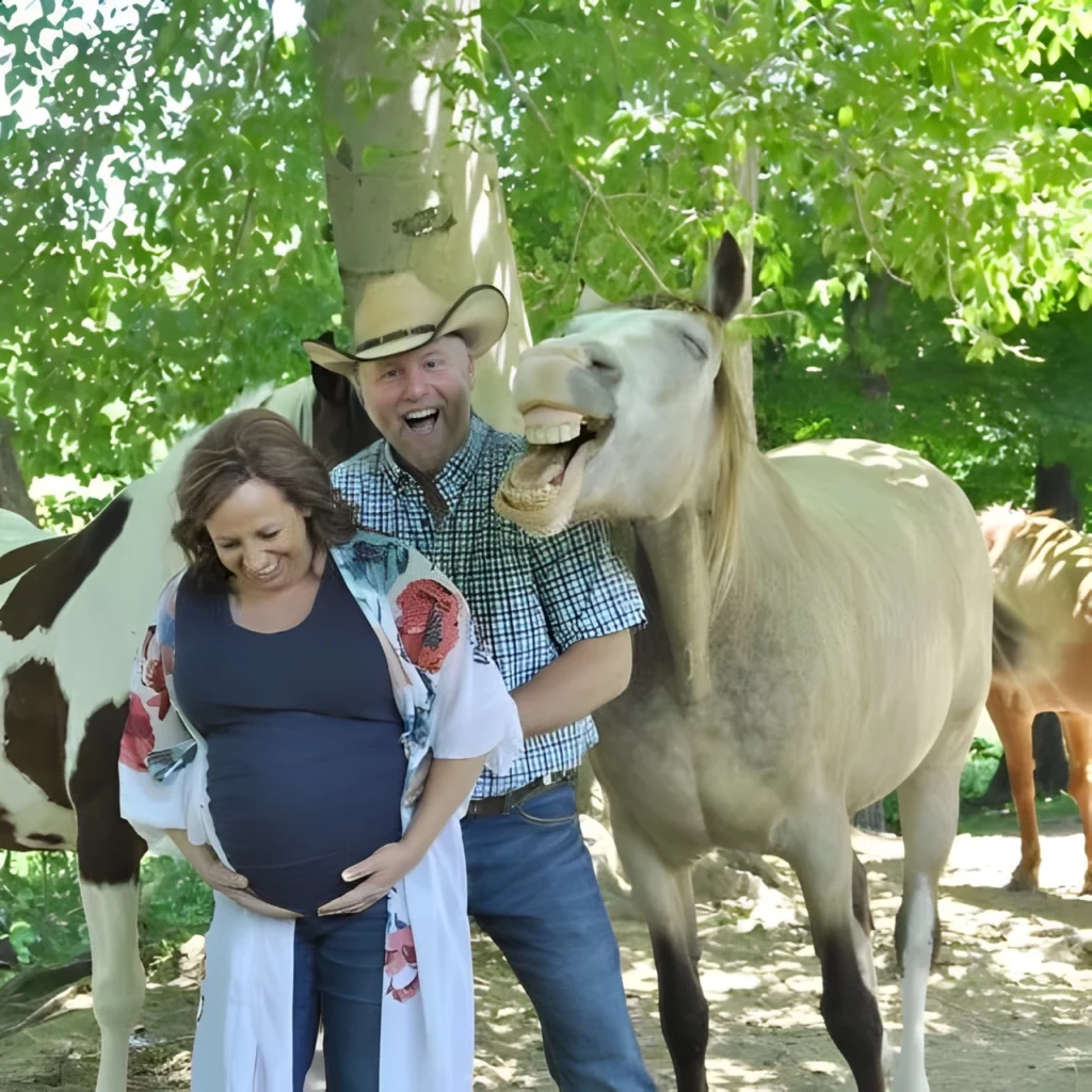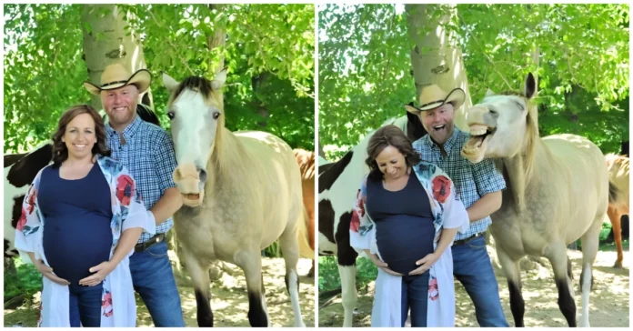 Amanda Eckstein and Phillip Werner planned a heartfelt maternity photo shoot to celebrate their upcoming baby, but their horse, Buckshot, had other plans. Instead of quietly standing by, the 12-year-old horse turned the session into an unforgettable experience. As the couple posed in a peaceful pasture, Buckshot decided to steal the spotlight with his over-the-top expressions. Photographer Kristen Zaffiro, who was capturing the moment, jokingly told Buckshot to smile—and to everyone’s surprise, he did exactly that. The horse flashed a huge, toothy grin, making the entire session a mix of laughter and chaos. The result was a collection of hilarious and unique maternity photos that quickly went viral. What was supposed to be a sweet and simple session turned into a moment no one would forget.