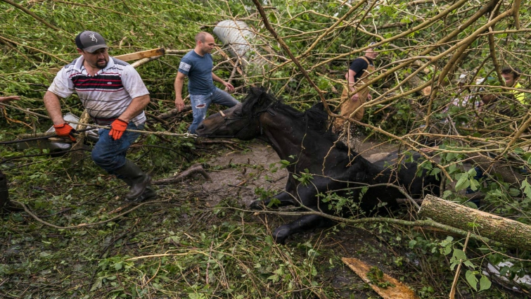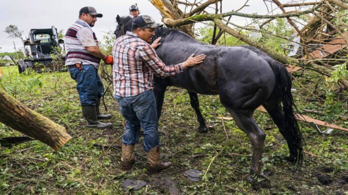 A horse, being there during the tornado was stuck into a bog remained there overnight until its owner – along with a team of family, friends and emergency responders – worked to drag it to safety. Owner says that the tornado carried the horse away from before dumping it in the bog.