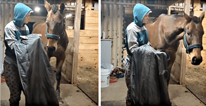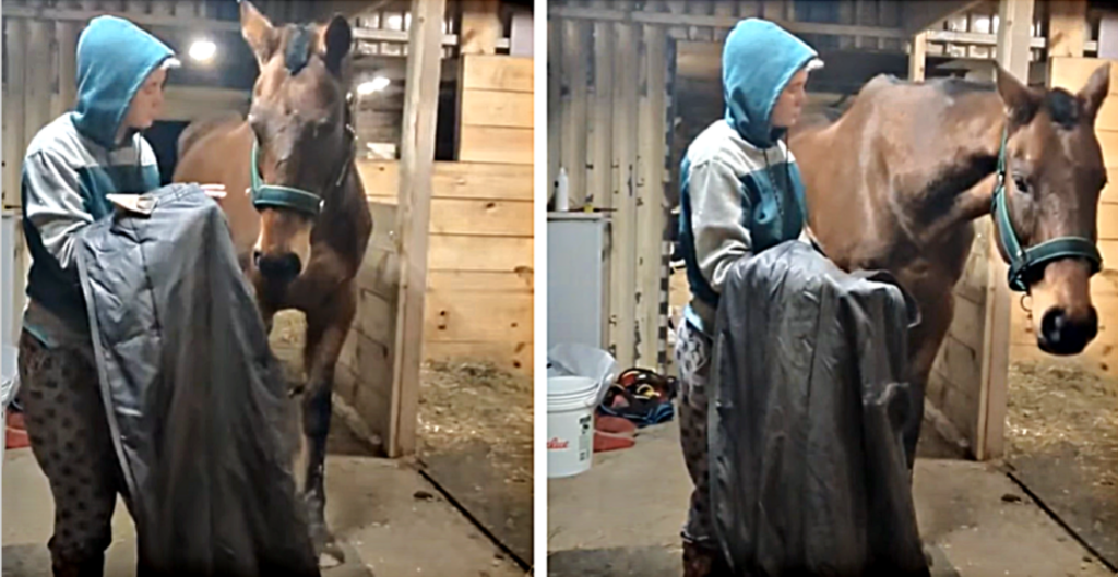Horses are beautiful creatures known for their grace, speed and intelligence. They have a deep emotional connection with their owners, and when treated with love and respect, they can form a bond that lasts a lifetime. However, not all horses are easy to handle, especially when it comes to covering them with a blanket. Some horses, like the one in this video, can develop a fear of blankets due to past traumatic experiences. In this heartwarming video, we see an owner trying to put a blanket on her horse that has a blanket trauma. The horse, sensing fear, turns his head in the other direction, trying to avoid the blanket.