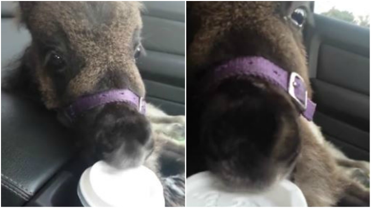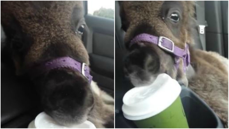 Thankfully the mini horse grew to be healthy due to his amazing caretakers in Brisbane, Australia. In the video below, the tiny brown foal is placed safely into his owner’s car, right beside a green cappuccino sitting in the cupholder. Dumbledore definitely has his eye on the prize.