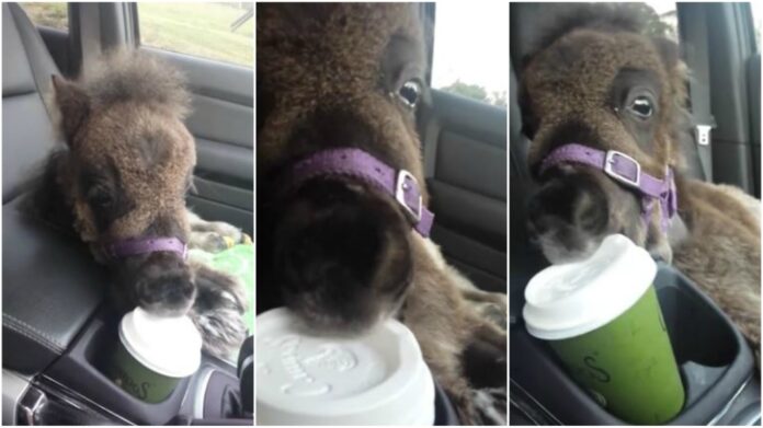 Thankfully the mini horse grew to be healthy due to his amazing caretakers in Brisbane, Australia. In the video below, the tiny brown foal is placed safely into his owner’s car, right beside a green cappuccino sitting in the cupholder. Dumbledore definitely has his eye on the prize.