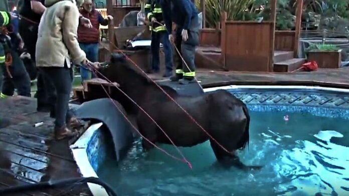 This horse fell on a pool.  in Sonoma County, California. The visual may seem a bit ridiculous, but just imagine what that poor horse must have been feeling. Firefighters had to cut away from the deck in order to successfully free the horse. The horse, named Spirit, found her way into the pool at night. The owner of the home, Katy Poteracke, says she heard a loud thud right before her dog started barking. Obviously, something was wrong.