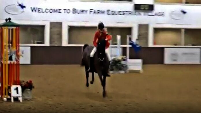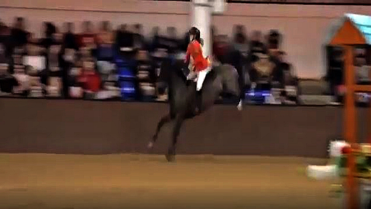The showjumping horse goes a little crazy and tries every possible way to throw the rider off, however, the rider managed to hang on until the end. She was holding her horse tight because it was indeed really difficult to stay on in a situation like that.