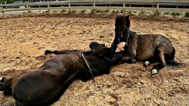 Two horses and their owner are having the best time of their life laying on the ground. It is simply adorable.  Just when you think things couldn’t possibly get any cuter, one of the big guys starts kissing her face with his huge tongue! As the video continues it becomes even more obvious how comfortable these two horses are with their mom.