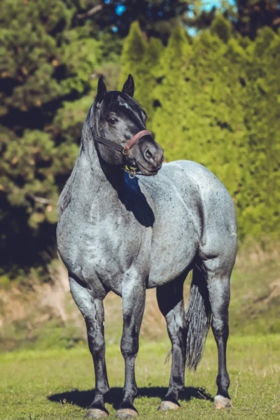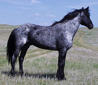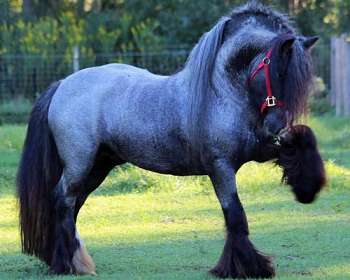 4. Blue Roan. This Gypsy Vanner stallion has a unique blue roan color. The body shows flecks of blue/gray and the mane, tail, face, and legs are often almost black in color.
