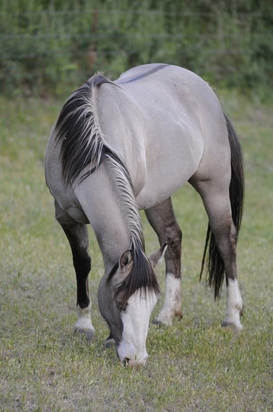 5. Grullo Duns are known for their tan-gray coats with a silvery sheen, dark mane, and tail, striped legs, and back..