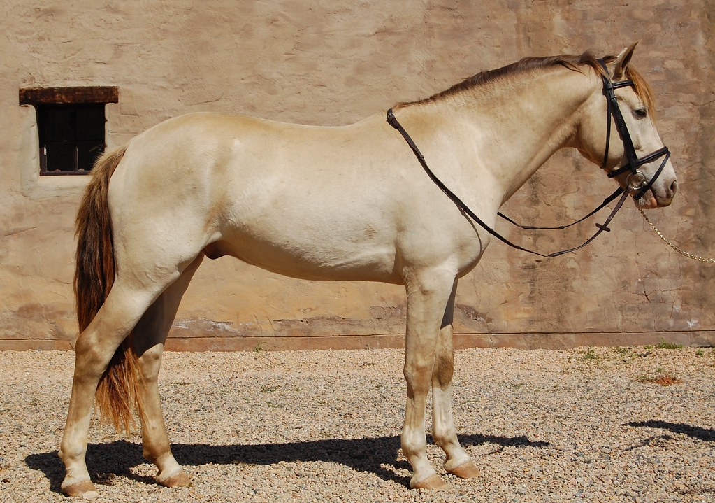 6. Amber Champagne. The characteristics that distinguish a champagne horse are light eyes (usually amber), pink skin that is mottled or freckled, and body-color that is diluted. The horse below also has an amber mane and tail.