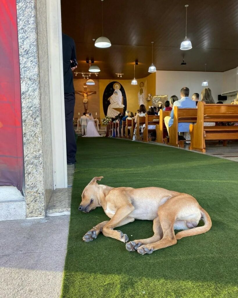 It was a beautiful day when Caramelo, a stray and injured dog, wandered into their lives. The couple was about to exchange their wedding vows in a local church when this remarkable dog casually strolled into the ceremony. What happened next was nothing short of magical. Caramelo blended into the crowd, watching the proceedings with a serene demeanor. It was as if he knew the significance of the moment. As the ceremony concluded, Caramelo stood at the church door, ready to offer the newlyweds a special gift – his warm hugs and kisses. When Tamíris and Douglas stepped out of the church, they were greeted by Caramelo’s enthusiastic wagging tail and heartfelt congratulations. The couple was overwhelmed by the dog’s sweetness and presence at their wedding.